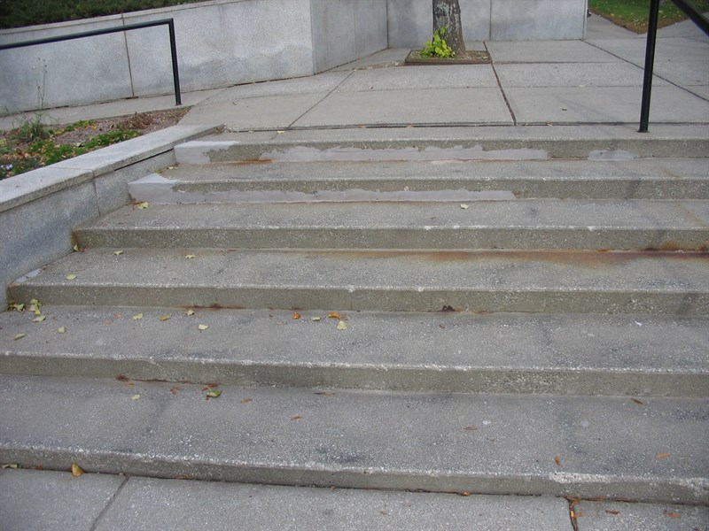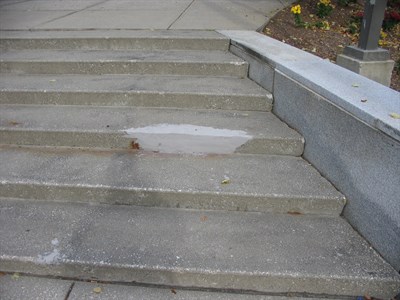 Main entryway plaza steps from the street and into the courthouse had several unsightly spalls and cracks in the concrete caused by winter freeze thaw and use of chemical deicers.