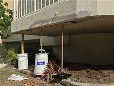 1. Close up of the damaged balcony 2. Preparation underway 3. Application completed with temporary shuttering in place 4. The restored balcony