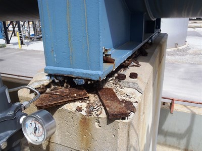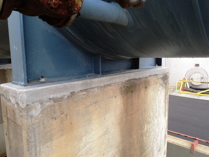 Problem: Three 96" dia. x 20' long bulk sulfuric acid and caustic storage tanks located in the water treatment plant. The 1.5" - 2" thick existing grouting system between the steel supports and the concrete base has become broken and dis-bonded. This has exposed the wooden leveling shims. The wooden shims have become rotten over time and require removal and replacement.
