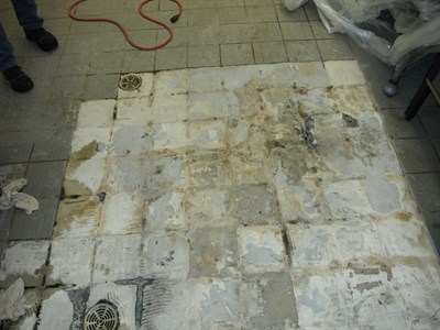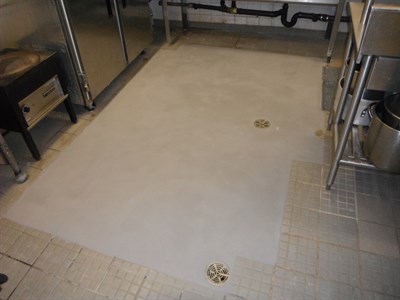 Application was carried out in accordance with Belzona Know-How System Leaflet FPA-1. To prepare the area, the broken tiles were removed down to the concrete and cleared of any loose material or contamination and abraded to expose the aggregate. Concrete was treated with a layer of Belzona 4191 pior to the Belzona 4131 application. Belzona 4131 was applied to the area initially spreading to a general level using normal screeding technique and then smoothing off using a steel float in accordance with Belzona Instructions For Use.