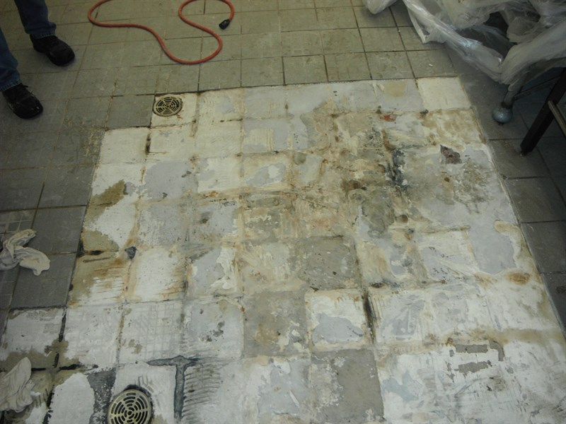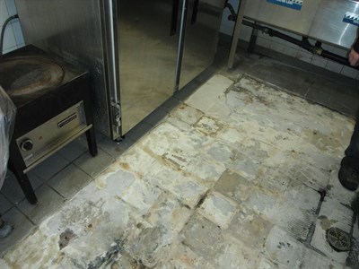 Problem: The kitchen floor tiles were undermined by water, penetrating the grout and loosening the tile adhesive causing them to lift and break. This created a Health and Safety issue.