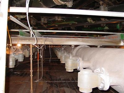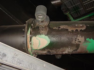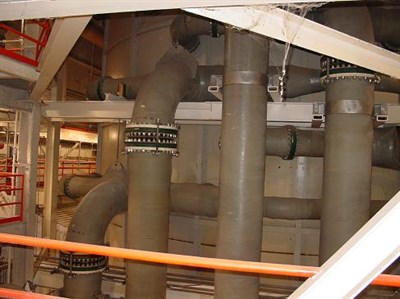 Problem: Lime slurry from the four spray levels above had caused an existing polyurea coating to fail exposing the relatively soft FRP piping to the erosive forces of the lime slurry. Should the piping become holed, side streams would decrease the overall scrubbing efficiency resulting in increased operating costs.