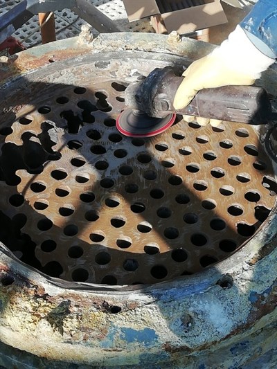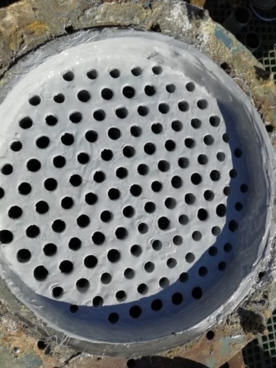 The surface was prepared using a mechanical grinder to remove contamination, getting back to clean & strong graphite, and achieving a rough surface. PVC tubes were inserted to form a mold around which the Belzona material can be poured, to restore the tube sheet back to it's original surface. Belzona 1391T was poured into the damaged areas, restoring the surface dimensions, and used to coat the entire surface, protecting from further damage. The application was carried out in accordance with a modified version of Belzona System Leaflet HEX-01 and HEX-03.