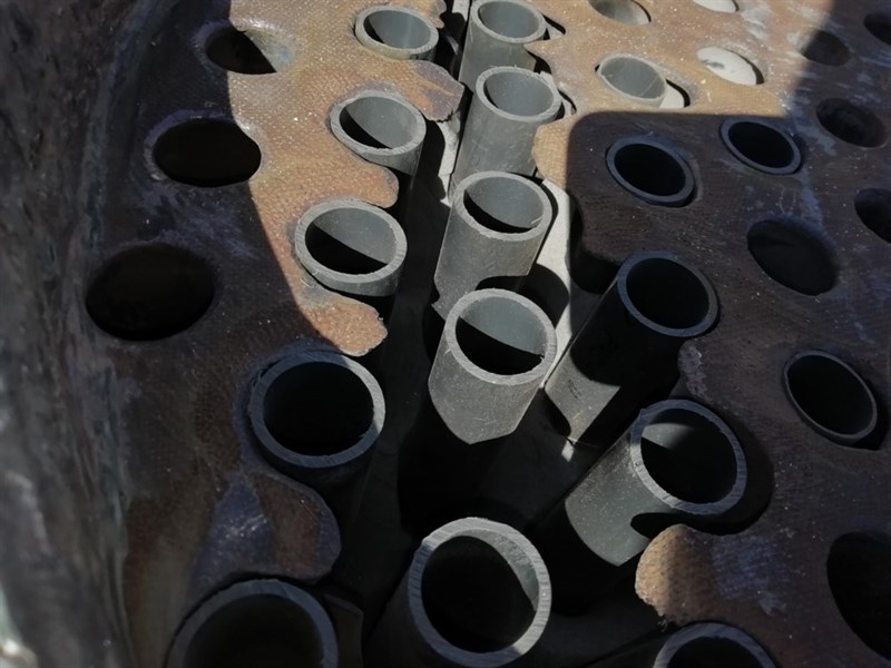 At a facility producing sulfuric acid from copper production by products. A heat exchanger with a graphite tube sheet, operating at temperatures up to 75ºC carrying dilute sulfuric acid, chlorides, and entrained solids.
