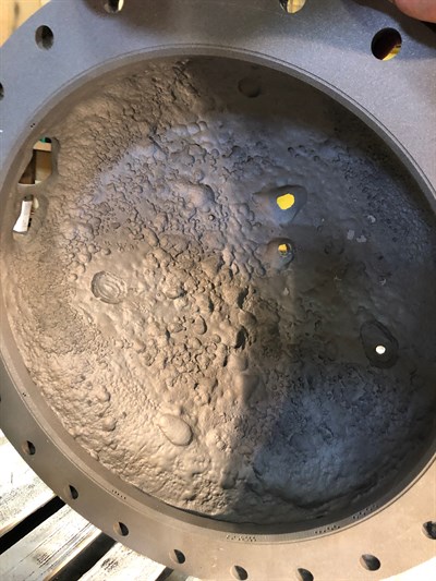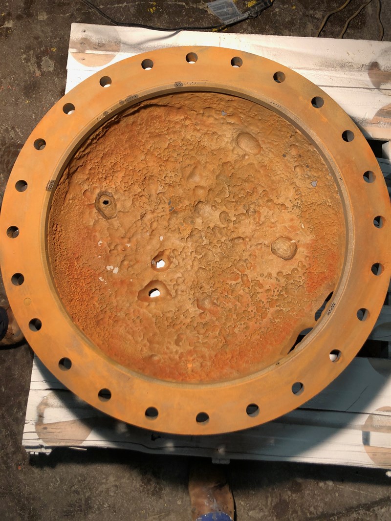 Problem: Seawater had severely corroded this end cover causing very thin wall conditions leading to holing. Holes were more pronounced after grit blasting. The end cover was also severely pitted.