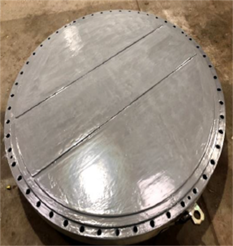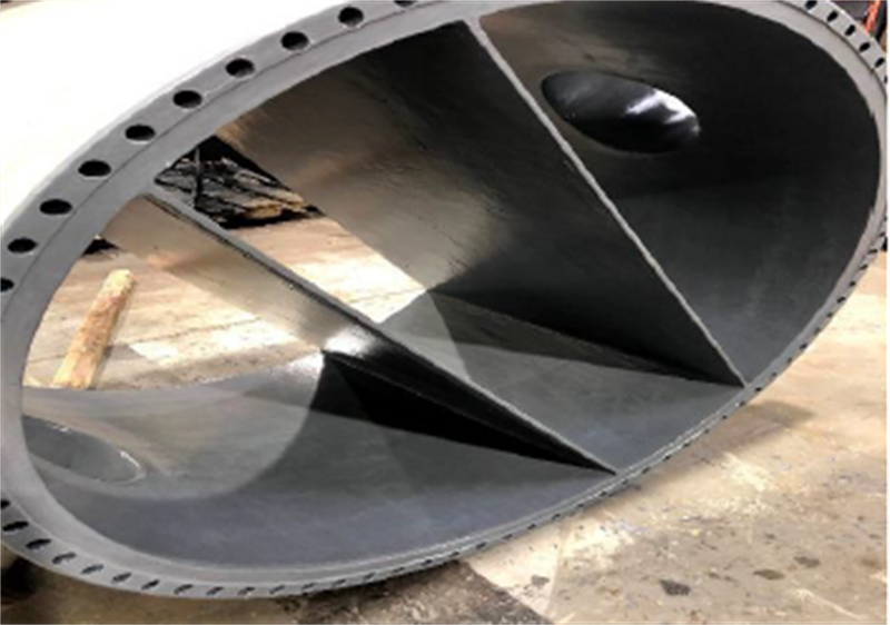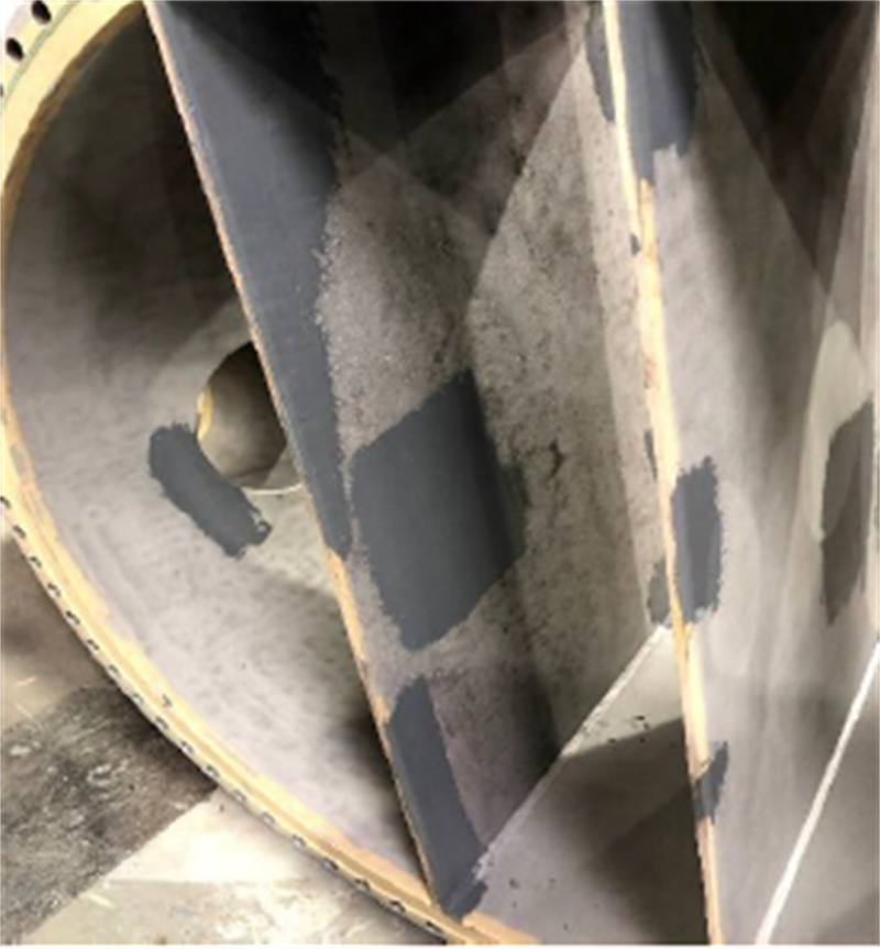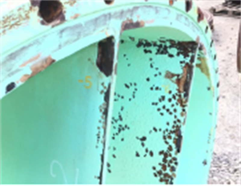 The existing coating was removed during the grit blast preparation. The metal was prepared to SA2.5 & 75 microns. Any areas of metal loss were repaired using Belzona 1311 Ceramic R metal. Two coats of Belzona 1321 Ceramic S Metal were then applied for future erosion/corrosion protection.