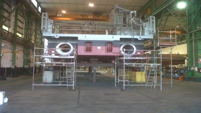 Stainless Steel water jet nozzles on a naval landing craft in dry dock.
