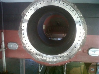 The stainless steel nozzles were machined to leave a rough profile to maximise the adhesion of the Belzona materials. Where the nozzles connect with the hull, grit blasting was carried out to achieve a white metal finish in accordance with Sweedish Standard SA 3. Belzona 1321 (Ceramic S-Metal) was applied to the surface entire surface by brush. Belzona 1812 (Ceramic Carbide FP) was applied in the areas subject to high impact and abrasion. A final layer of Belzona 1321 was applied over the entire area to leave a smooth surface. The application was carried out in accordance with a modified version of Belzona System Leaflet SOS-02.