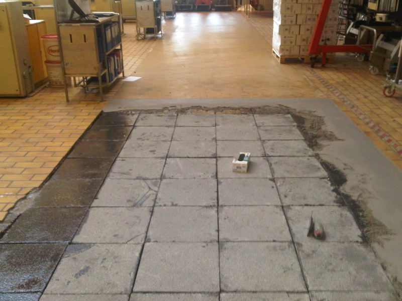 Three areas of extremely uneven flooring in the bottling hall. Areas included failing quarry tiles, epoxy screed and concrete.