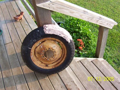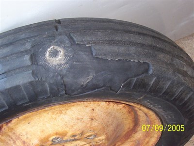 Damaged obsolete U.S. Royal 5.50-16 implement tread tire from J.I. Case 140w hay baler.