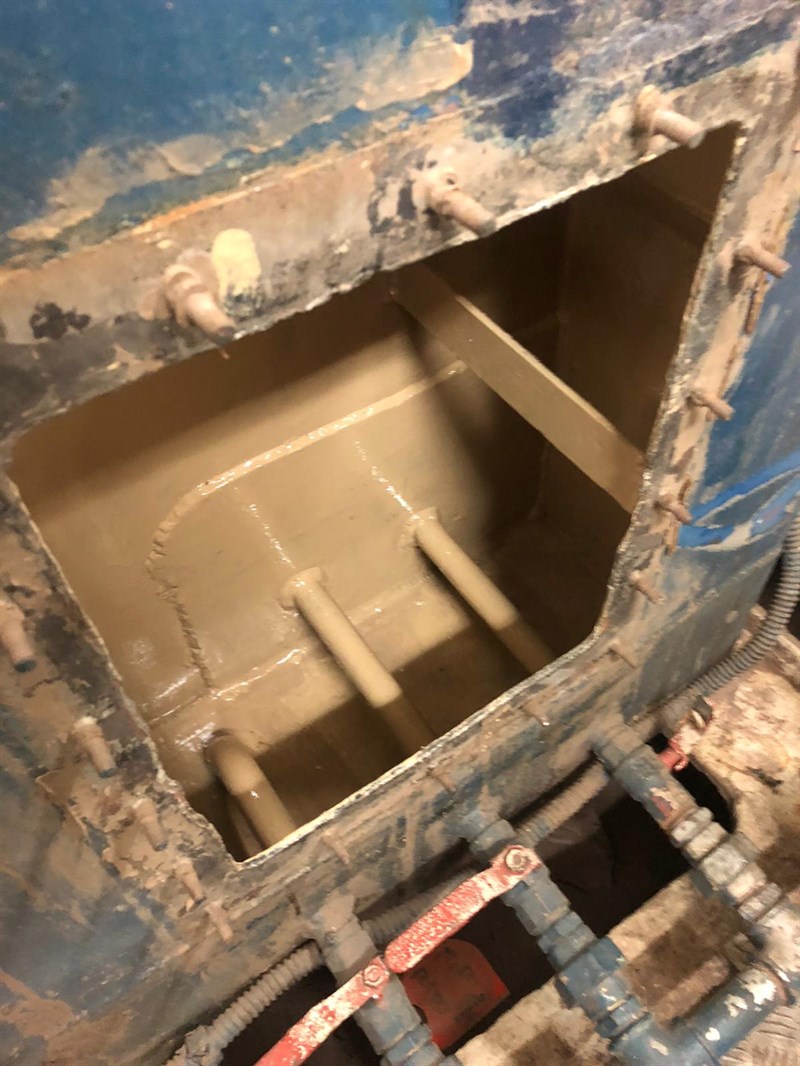 A marine sewage tank was identified as having thin wall areas on its base caused by corrosion. The existing protective coating system inside the tank had broken down. A repair & protection system was required to extend the life of the asset.