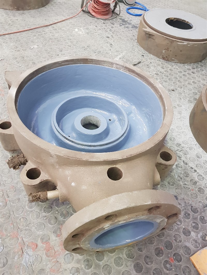 1 - Damaged Pump prior to application 2 - Repaired and coated casing 3 - Repaired and coated end cover 4 - Completed application ready for re-assembly