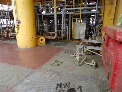 Problem: Years of service without adequate maintenance in the offshore environment caused severe corrosion/metal loss of the production deck, impacting the structural integrity and personnel safety.