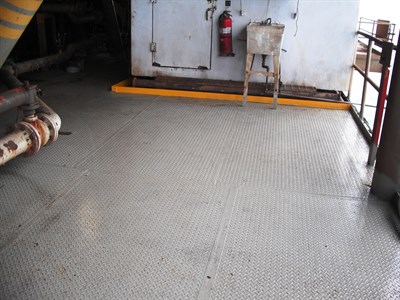 The deck area to be restored was cleaned and prepared by UHP/aggregate/rust inhibitors. Belzona 9111 was used as a wipe down to clean and degrease all areas. The Belzona Cold Plate Bonding System was installed using Belzona 1121 as adhesive. A two coat system of Belzona 5811/Aggregate was installed afterwards. The aggregate was used to create an antislip surface.