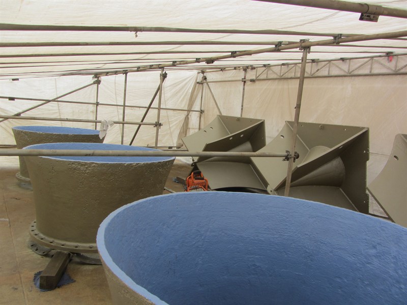 The application was carried out in accordance with modified versions of Belzona Know-How System Leaflets CEP-1 and CEP-3. Belzona 1121 was used to rebuild and repair the eroded surfaces. Belzona 1341 was used to improve the pumps performance. Due to the large size of the pumps and related inlets and outlets, it was decided to blast in stages and then protect with Belzona 1341. This was followed by a skim coat of Belzona 1341/1121 mixture to fill in most of the lower depressions. The remaining voids were filled with Belzona 1121. The units received a final brush blast before 2 successive coats of Belzona 1341 grey and blue were applied.