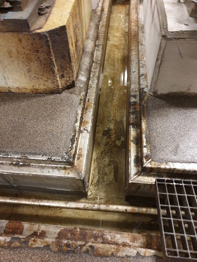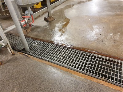 Problem: The historic flooring had insufficient gradient for the chemicals to lead into the channels therefore the chemicals were pooling on the floor close to the channel, the old channels had weld seams which was causing leaks. This year the client needed to repair the drain-channels in the process basement and the distillery. There were two different problems. Problem One: The old factory (to be taken out of production in a couple of years), the flooring around the channel was deteriorated and uneven, and caused chemical waste to be lying still, without running down in the channel for transportation to the waste treatment process. Problem Two: The distillery area, waste channels needed a coating, due to weld seams that had cracking. The client requested the bottom of the whole channel to be coated, and also the sides.