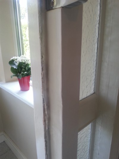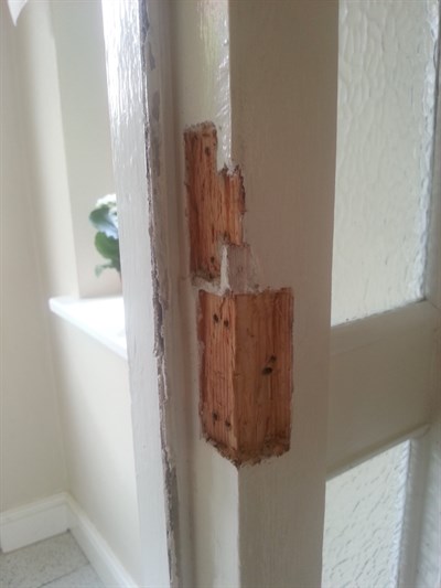 Problem: A new door had been fitted with a new lock and catch. The position of these had to be changed leaving two cut outs in the door frame from the old lock and separate catch.