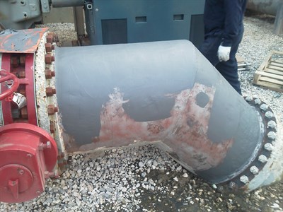 Problem: Non-destructive testing (NDT) showed where heavy corrosion had caused major pitting resulting in thin walled pipe in many areas and through wall in one spot.