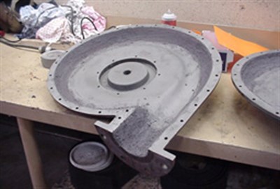 - Worn fan casing damaged from abrasive particles is rebuilt and protected with Belzona® 1812.