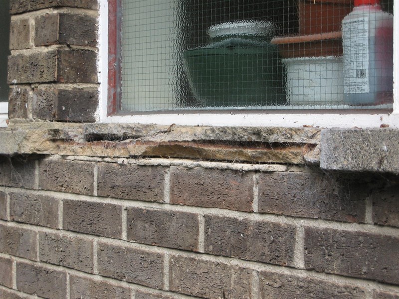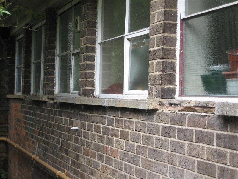 Damage to conrete window sills due to corrosion of reinforcement bars.