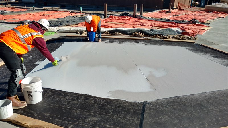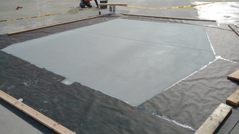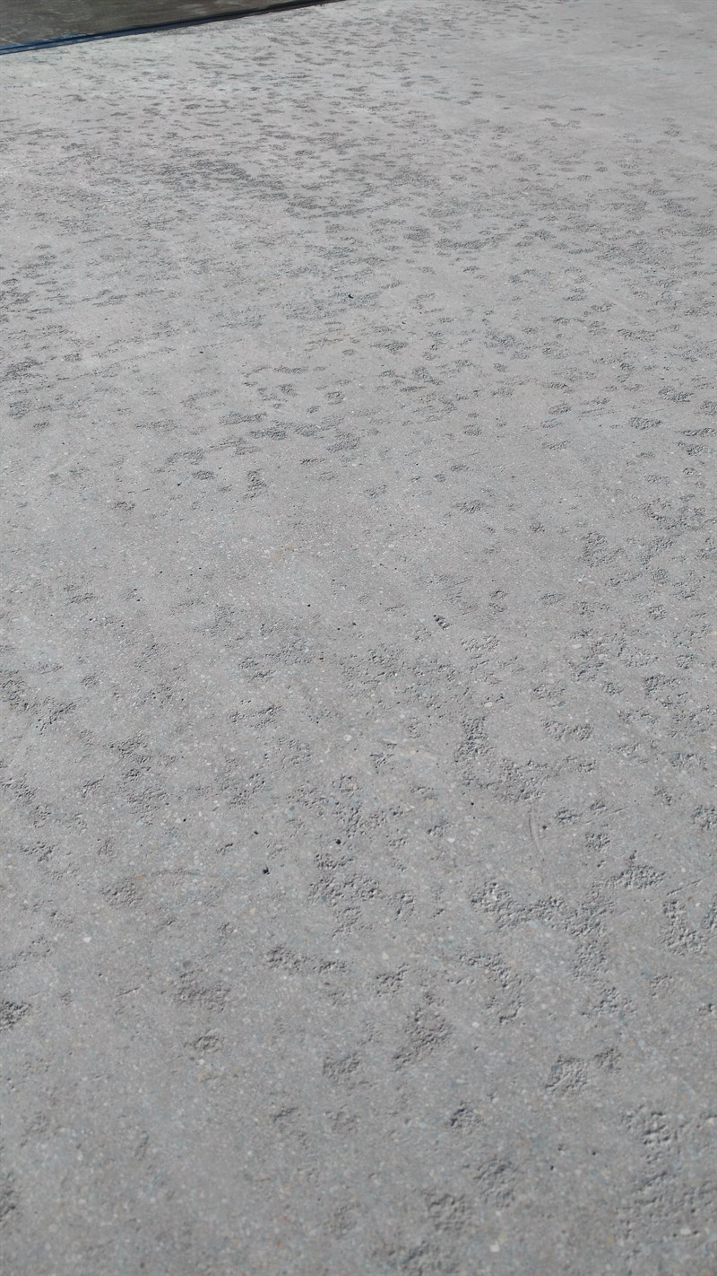 We waited for the fresh concrete to fully cure. Surface prep was done with hand grinders to remove all of the surface laitence and loose material from the spalling. There were still some areas of deeper pitting that we addressed by "flooding" on the first layer. The first layer, Belzona 5231 in light gray color, was applied using a squeegee to spread it around, and smoothed over using a roller. Then a light gray quartz aggregate spread by hand to refusal. We allowed that to cure for a couple hours, and then we were able to vacuum the excess aggregate off the top and apply the second layer, Belzona 5233 Clear with rollers and allowed to fully cure.