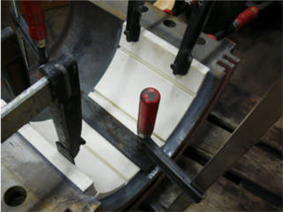- Thordon SXL bearing half mounted and glued with Belzona® 1321. Clamps are used to hold bearing in position