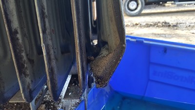 Electrical transformer cooling fin damaged by a forklift at a local recycling center.