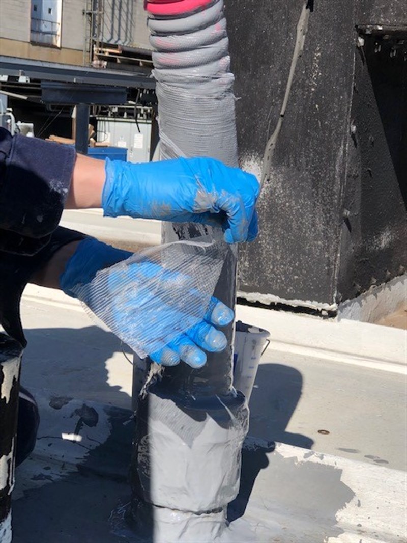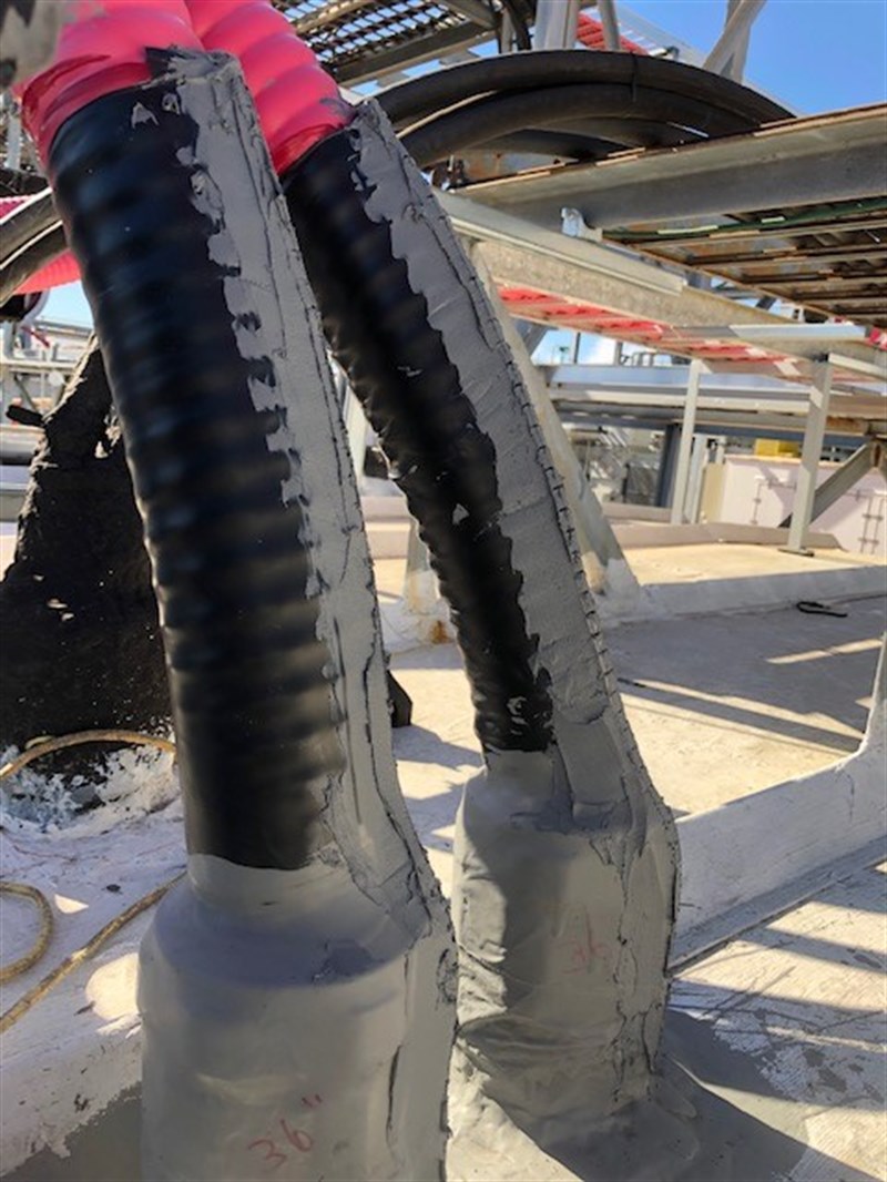 After removing any loose debris we then cleaned each boot with 9111. We then applied the 1121 to each side of the zipper to create a more uniformed surface area.Once the 1121 cured we then applied a coat of 3121 to the zipper boot. The applying the 9341 wrap at a minimum of thirty-six inches in height. Once the wrap was was competed we then added the final coat of 3121 over the wrap completing the job.
