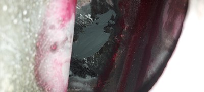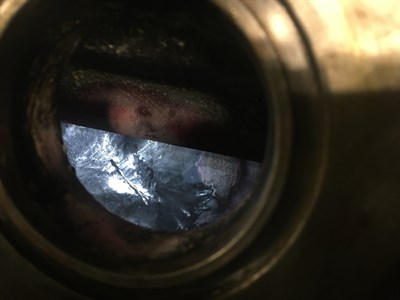 Grinding using a small size electric rotary file was followed by a cleaning and degreasing with 9111 prior the application of the mixed 1212. The paste has been applied with a Belzona spatula through an 80mm (3,15") diameter exhaust hole while another colleague controlled and directed from the other side of the engine.